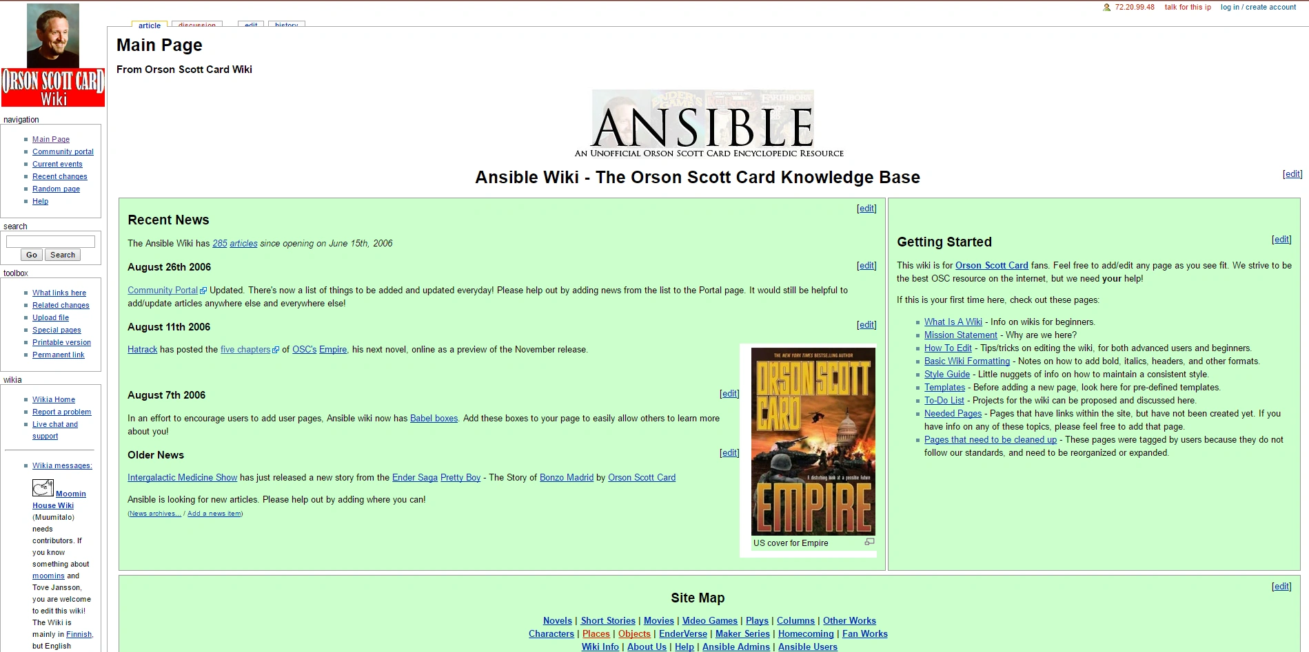 A few months after its founding, the main page of the Orson Scott Card Wiki looked like this. As you can see, Wikia's platform was totally different from how it looks today. Around this time, the short story "Pretty Boy" had just been released, and Card's non-enderverse novel Empire was set to be out in November.